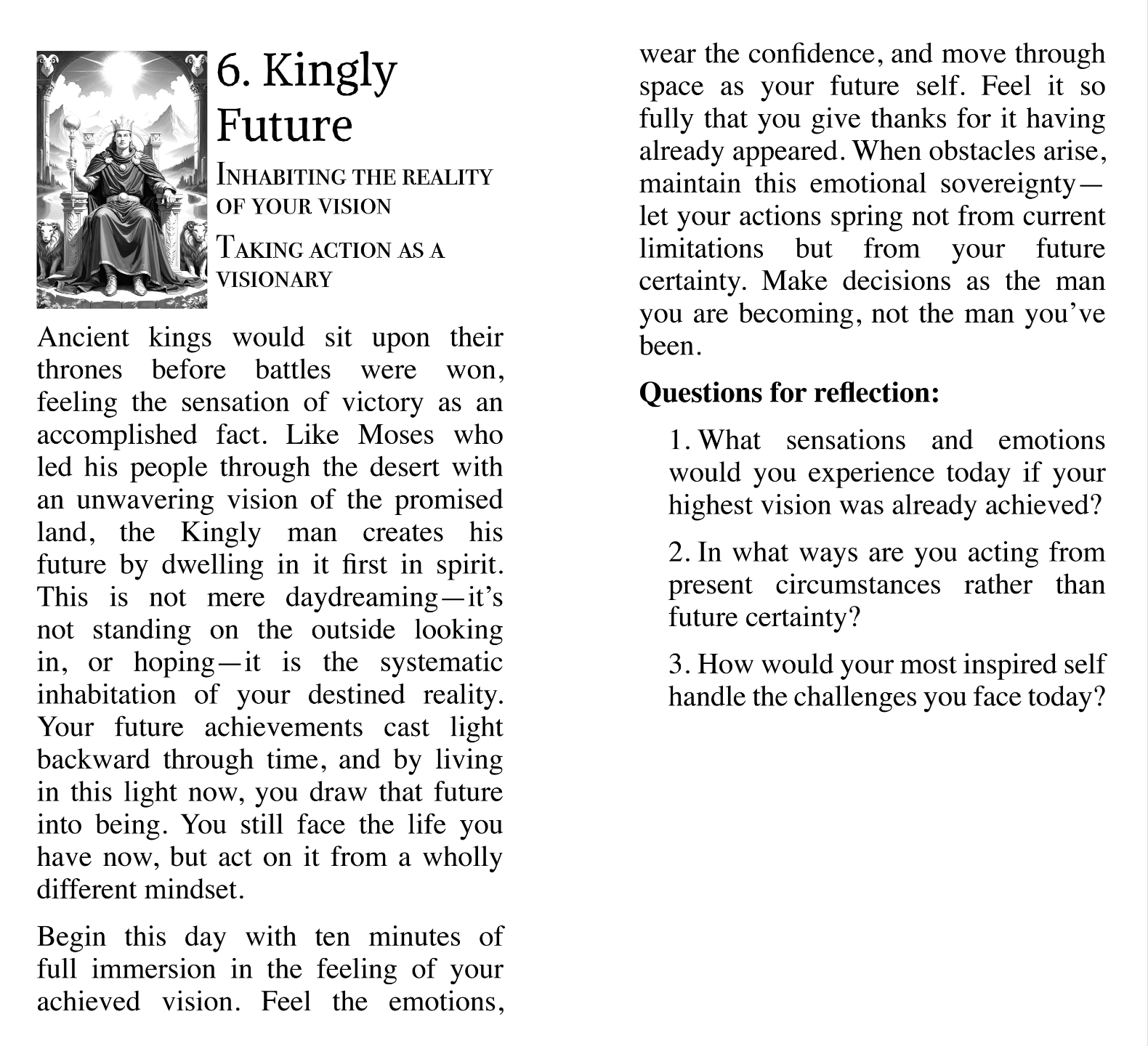Ancient kings would sit upon their thrones before battles were won, feeling the sensation of victory as an accomplished fact. Like Moses who led his people through the desert with an unwavering vision of the promised land, the Kingly man creates his future by dwelling in it first in spirit.