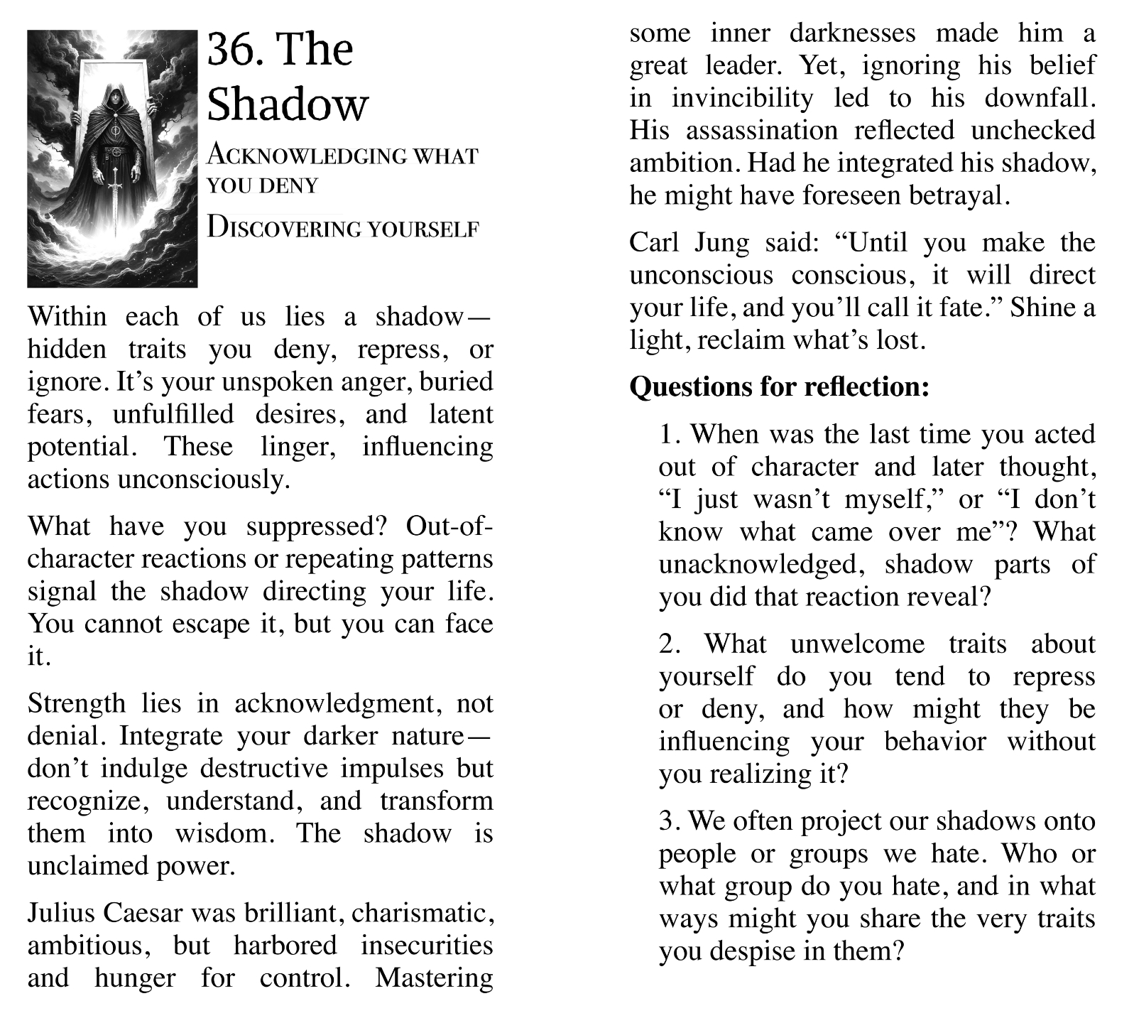 Julius Caesar was brilliant, charismatic, ambitious, but harbored insecurities and hunger for control. Mastering some inner darknesses made him a great leader. Yet, ignoring his belief in invincibility led to his downfall.